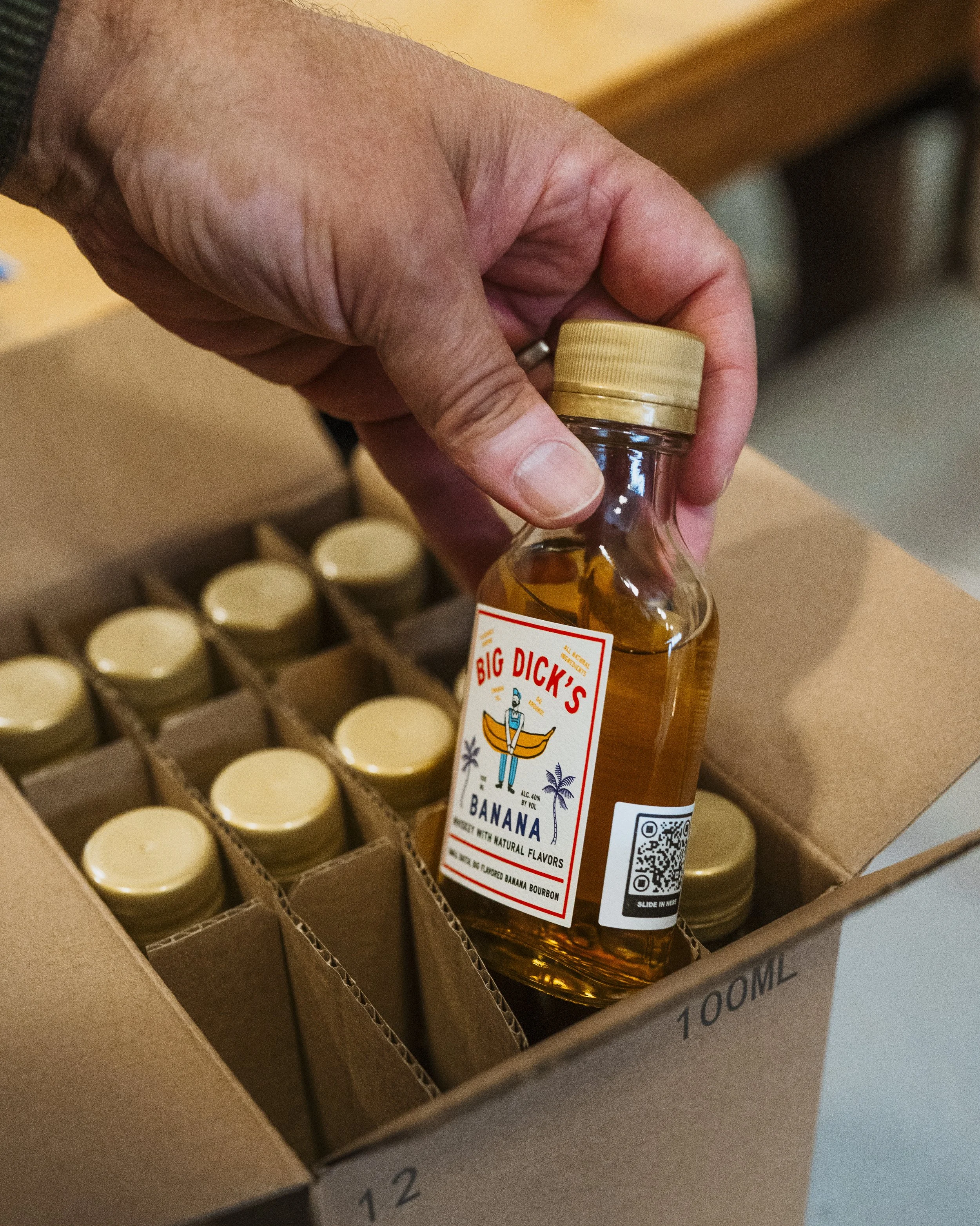 A full case of 100ml Big Dicks Banana Whiskey, that’s 12 bottles for $5 each plus shipping, direct to your doorstep. Or a 4 bottle sampler of 100mls, for $7.50 each. Either way, there’s plenty to share…